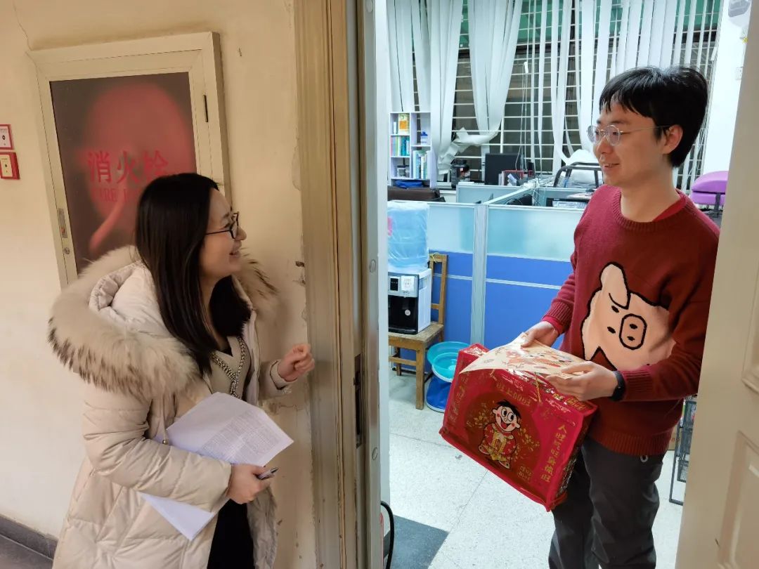 2022年1月25日,地空学院领导和老师逐一探访留校过年的同学们,为他们带来了新春祝福以及新年礼包。学院党委书记李培军,党委副书记王一涵,团委书记叶威惠,学工办赵静贤以及研究生辅导员们走访办公室和学生宿舍,将燕园“福”字和新春零食大礼包分发到200余位留校同学的手中。